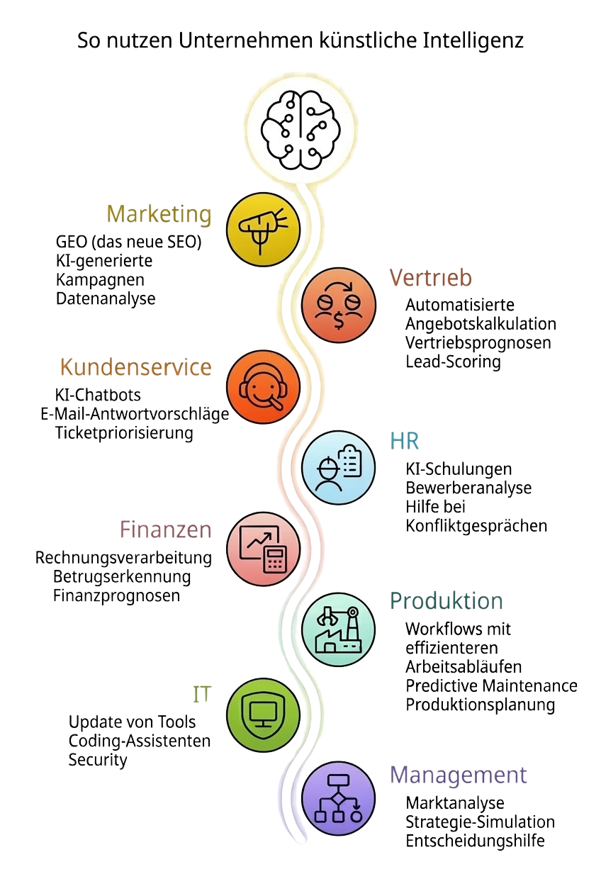 Besonders stark wirkt KI dort, wo sich Aufgaben wiederholen: E-Mails, Angebote, Protokolle, interne Wissenssammlungen, Marketing oder Kundenkommunikation. Wenn Du merkst, dass Dein Team viel Zeit mit solchen Aufgaben verbringt, liegt dort meist ein großer Hebel.